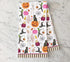 Bring on the spooky season with this playful Halloween tea towel featuring all your favorite classic icons—black cats, jack-o'-lanterns, ghosts, potions, skeletons, and more! The vibrant watercolor illustrations and bold black-and-cream striped border add a festive pop to any kitchen. Made from 100% cotton, it's both absorbent and durable, making it ideal for everyday use or Halloween-themed gatherings.